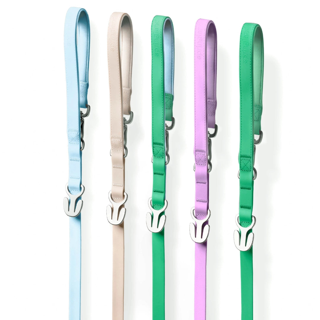 - 15 Waterproof Dog Leashes: 3 each in Sky Blue, Lilac, Oat, Sky Blue/Green, and Blueberry (All 5ft long).